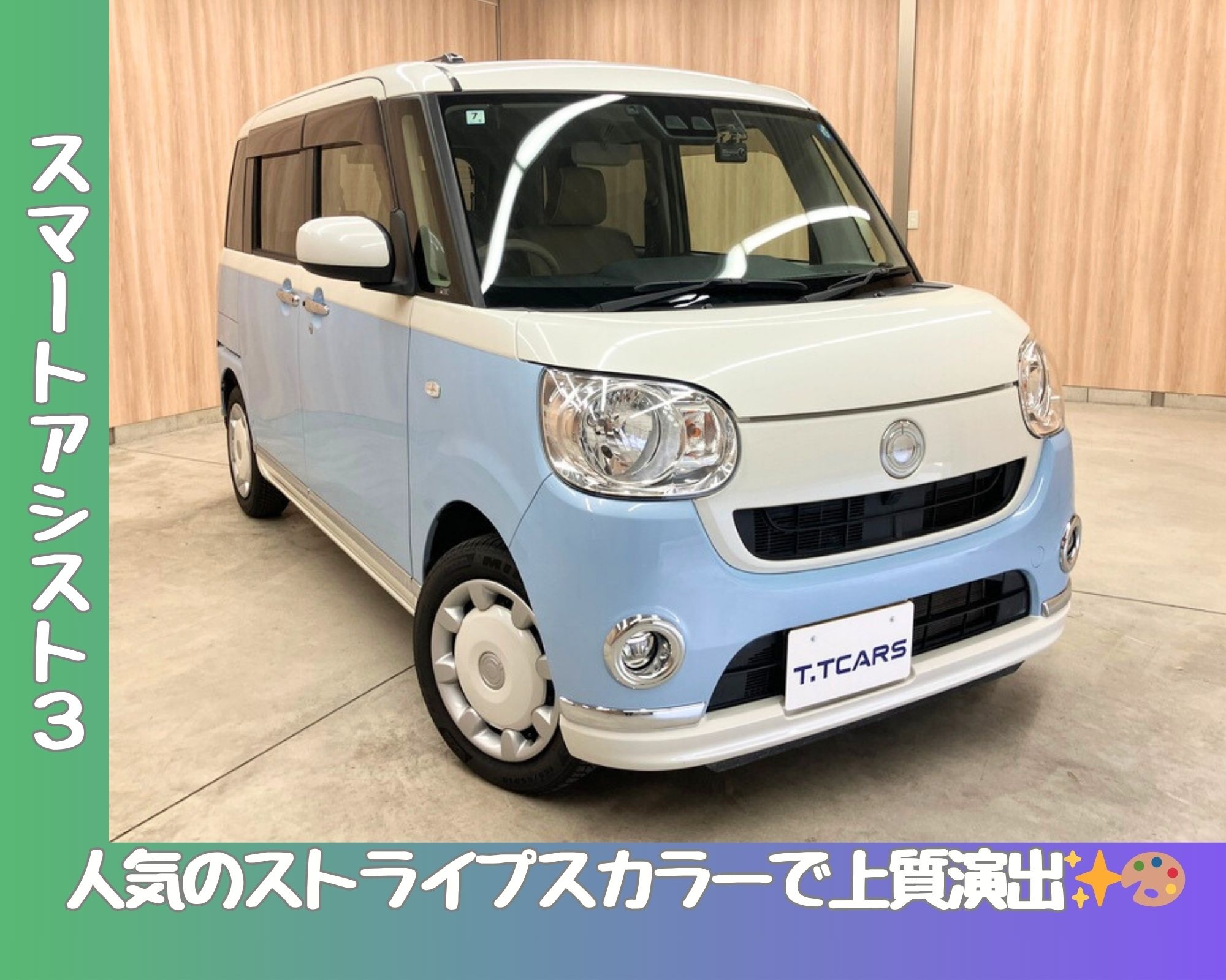 見た目もとってもかわいいホワイト×水色のストライプカラー。周りとの差をつけて自分だけの車をお楽しみください。